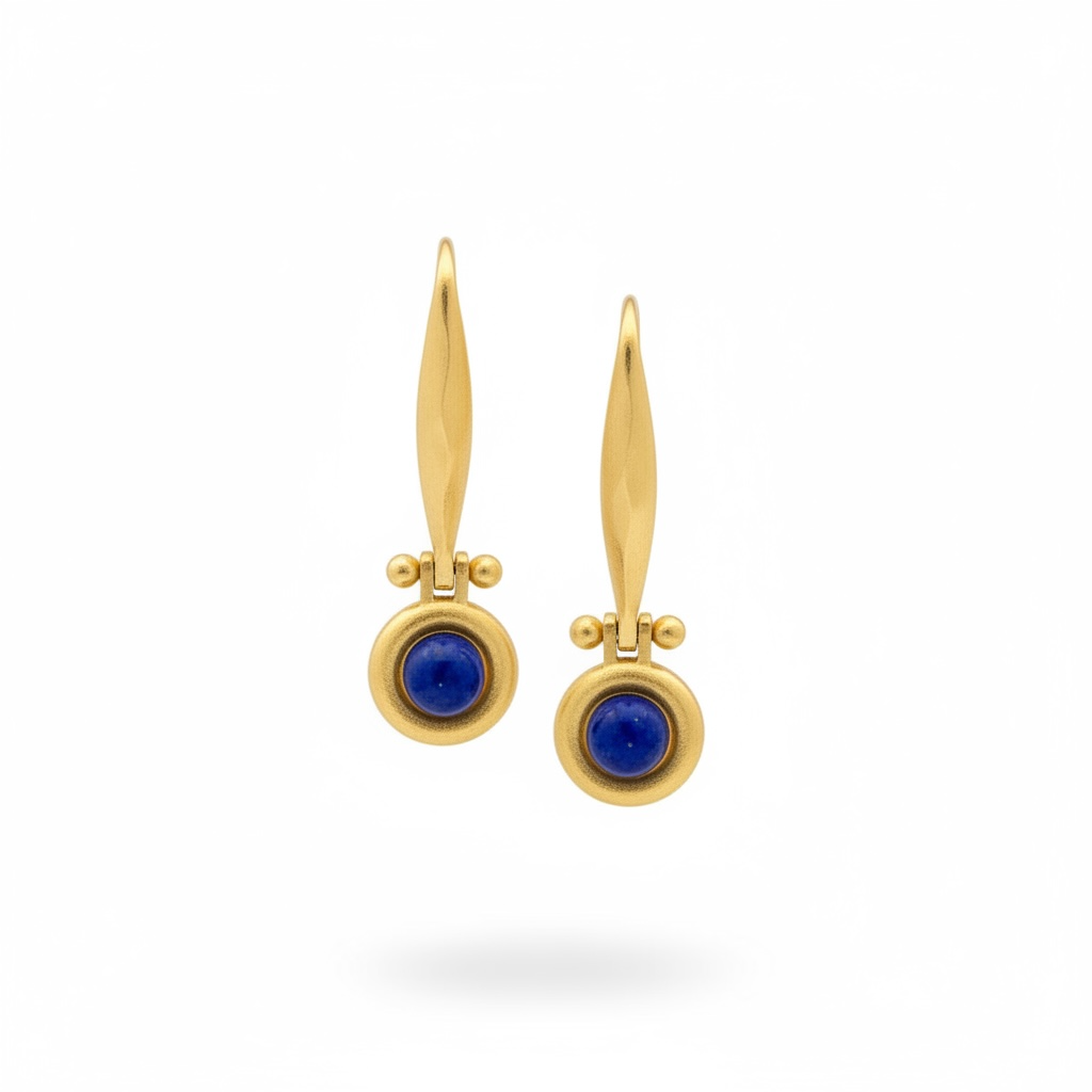 The Elysia earrings capture the quiet strength of feminine elegance through rich natural lapis stone and refined vintage design. Featuring a sleek elongated gold-plated hook and a circular lapis drop in a smooth bezel-style setting, these earrings bring a timeless yet powerful presence to your look.