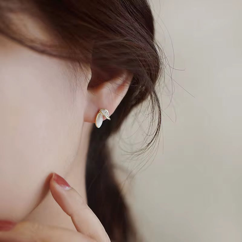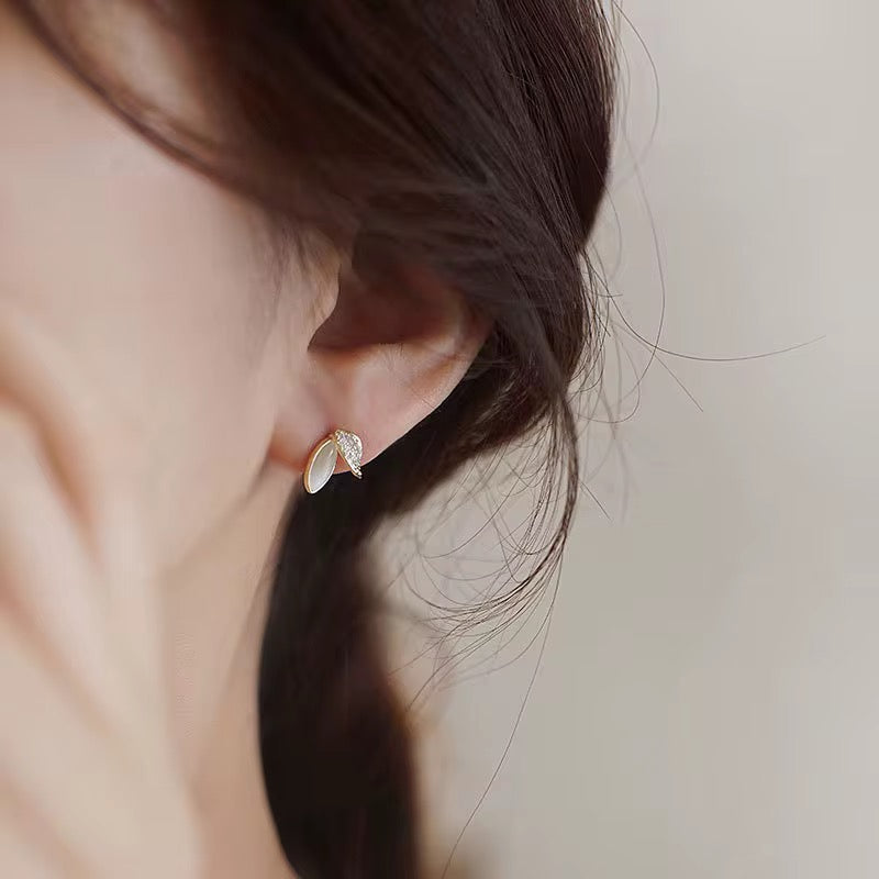 Crafted from sterling silver with 18-karat gold plating, these refined stud earrings feature an elegant dual-leaf design. One leaf is formed from iridescent mother of pearl, framed with a classic channel (Chanel-style) setting, while the second leaf is adorned with sparkling white zirconia stones, creating a soft contrast between natural glow and delicate brilliance.