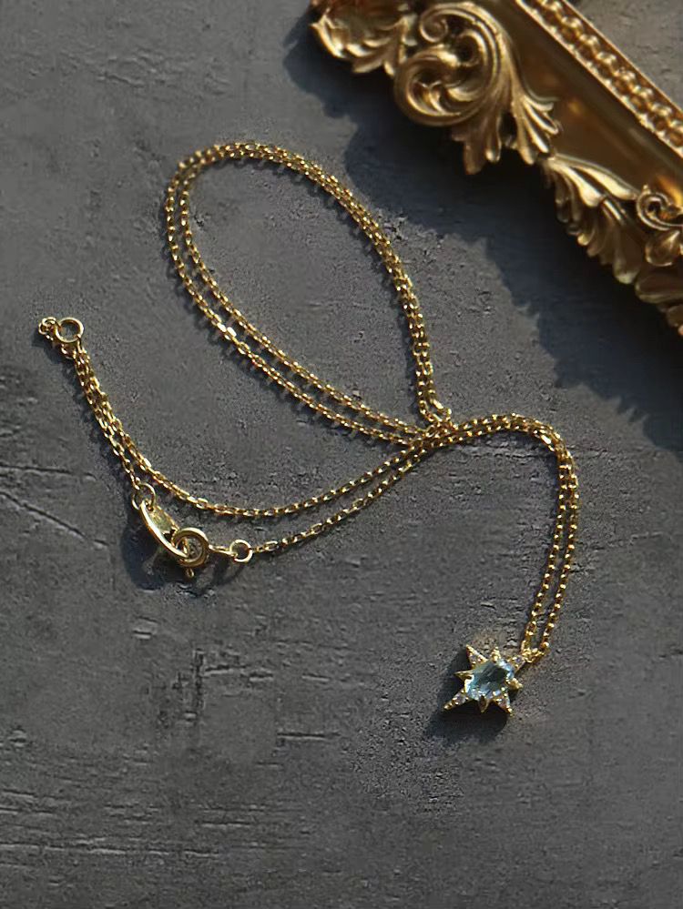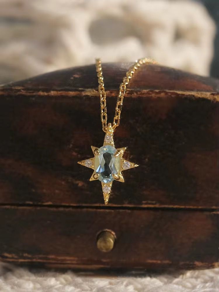 Crafted from fine quality sterling silver and finished with platinum plating, this necklace features a sleek snake chain paired with a striking North Star pendant. Each point of the star is delicately bezel-set with sparkling zirconia stones, while a soft light blue aquamarine stone sits at the centre, adding a subtle pop of colour and refined brilliance.