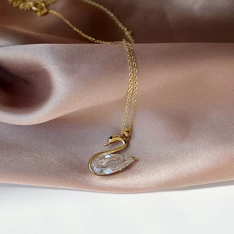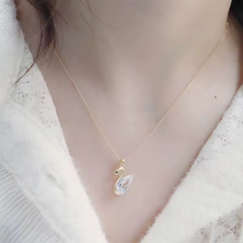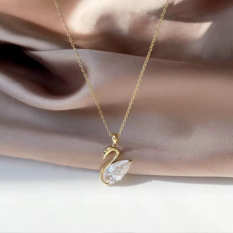 Crafted from 925 sterling silver and finished with 18-carat gold plating, this delicate necklace features a refined gold swan pendant. The swan’s body is adorned with a drop-shaped white zirconia, beautifully cut in a 5A princess cut to deliver exceptional brilliance and clarity.