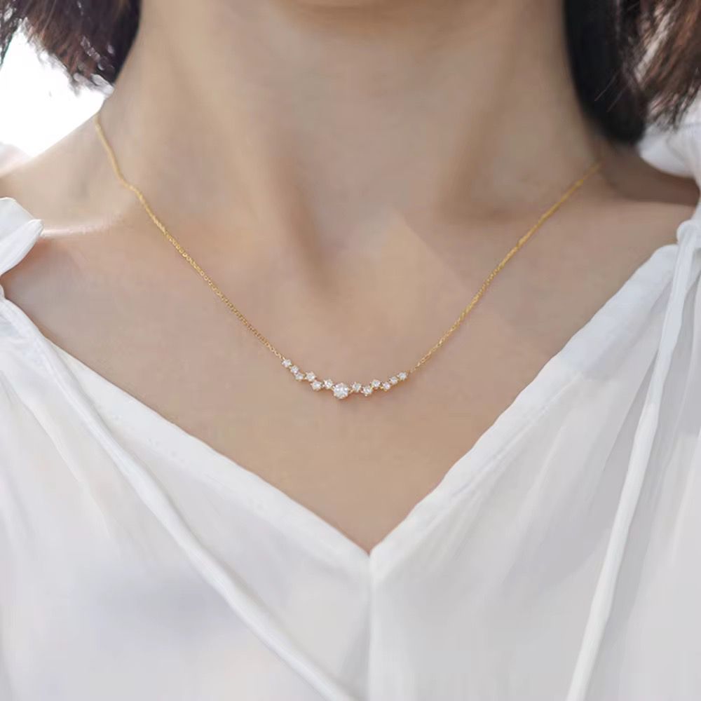 Crafted from high-quality sterling silver, this necklace features a delicate chain with a 5–6 cm section of irregularly set zirconia stones, creating a unique, asymmetrical shimmer that catches the light beautifully. The irregular placement gives a contemporary, slightly playful feel while remaining minimal and elegant.