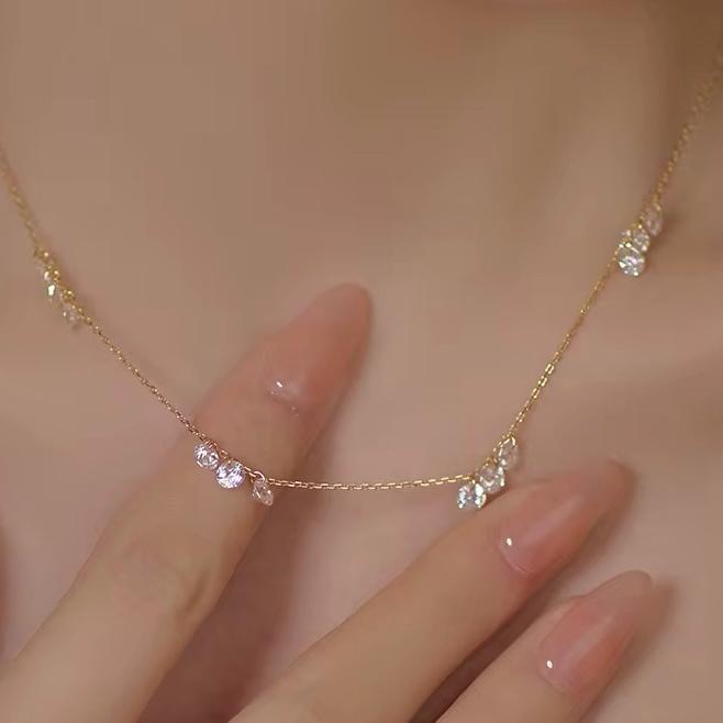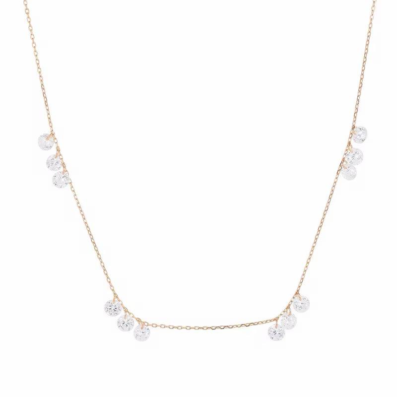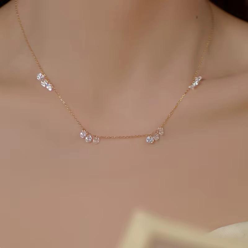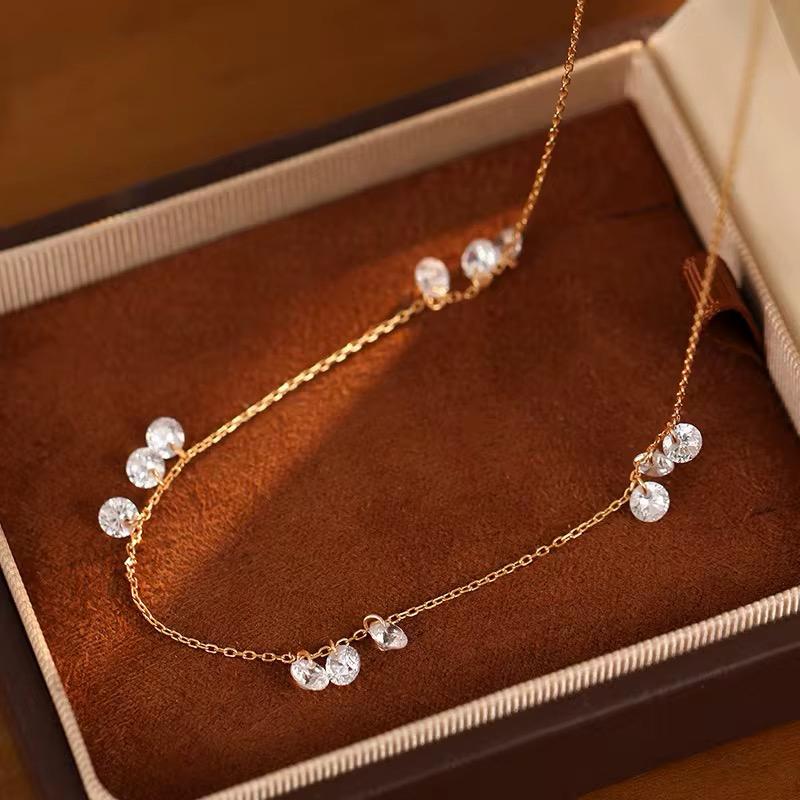 Crafted from fine quality sterling silver and finished with 18-karat gold plating, this delicate ghost chain necklace features clusters of round-cut 5A zirconia stones, carefully arranged to create a subtle yet eye-catching shimmer. Three zirconia stones are set together, repeated at even intervals along the chain, creating a beautifully balanced and refined look.