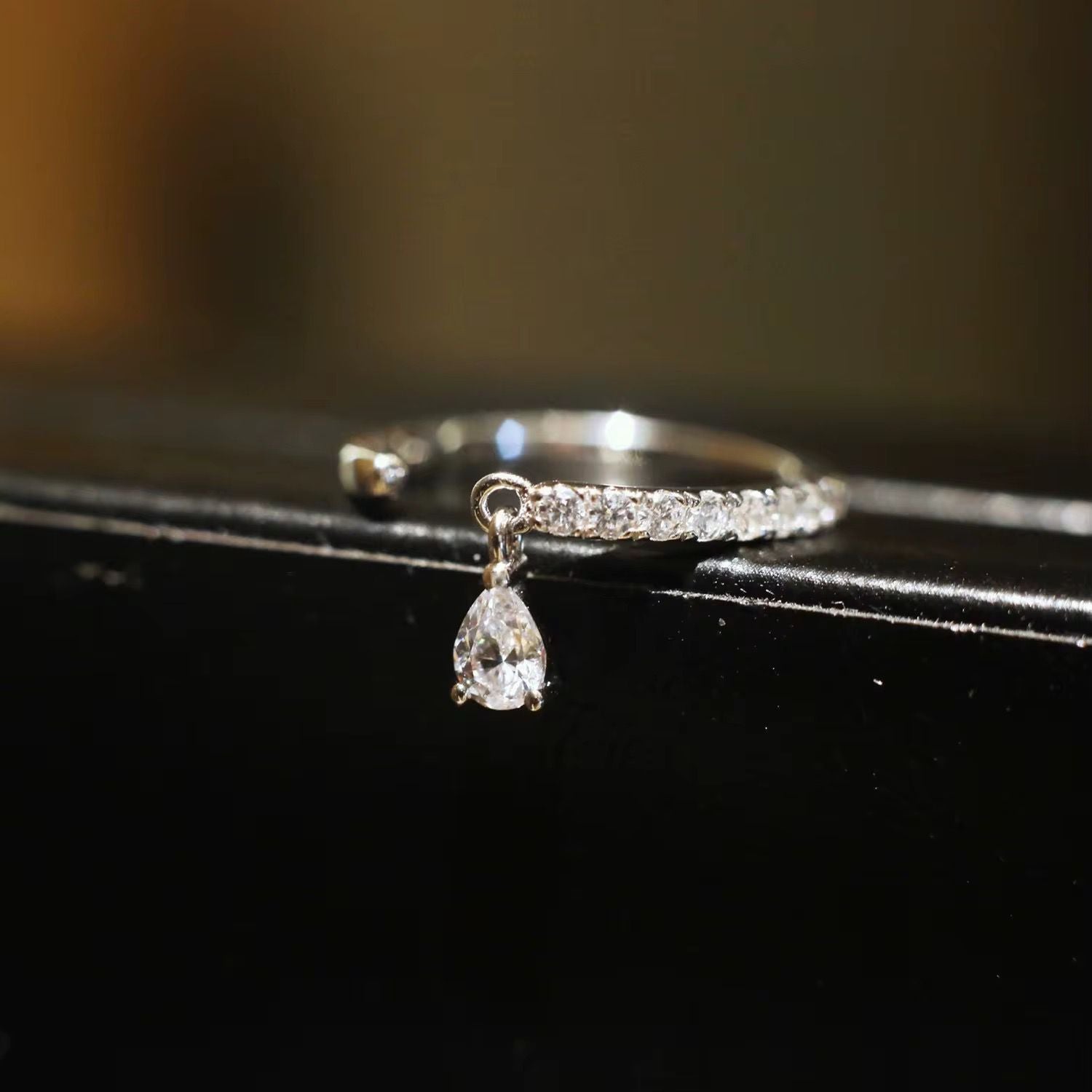 Crafted from high-quality sterling silver, this ring is fully set with shimmering cubic zirconia stones all around the band, creating a continuous sparkle. A water drop–shaped zirconia charm delicately dangles from the ring, catching the light with every movement.
